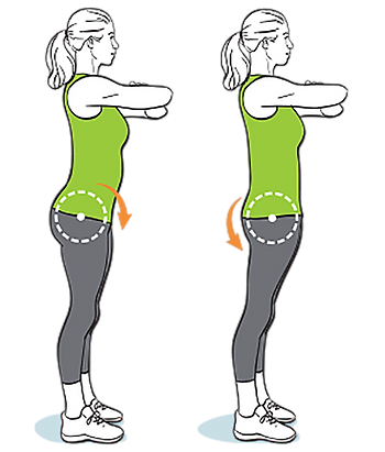 허리와 벽 사이의 공간을 줄이듯이 복부에 힘을 주고 골반을 앞으로 살짝 기울입니다. - 골반을 뒤로 기울이기