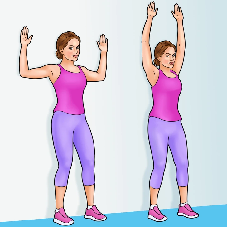 - 천천히 숨을 들이마시며 팔을 위로 들어 올려 'Y' 모양을 만듭니다. 팔이 벽에 계속 닿아 있도록 주의합니다.