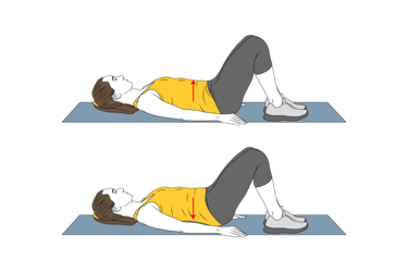 - 다시 천천히 골반을 내리면서 바닥에서 허리가 살짝 떨어지도록 합니다.